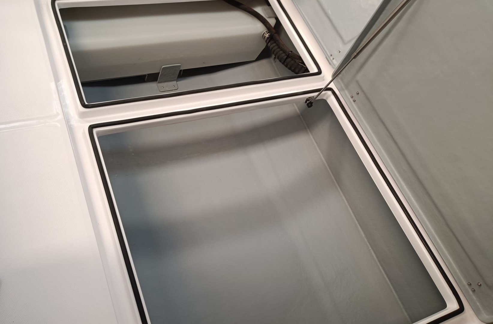 Este barco tiene dos amplios cofres de estiba en la bañera- lo que la hace ideal para pescadores-, una amplia timonera abierta que ofrece protección y abrigo navegando y una cabina pensada para descansar en la litera, así como estibar todo lo necesario.