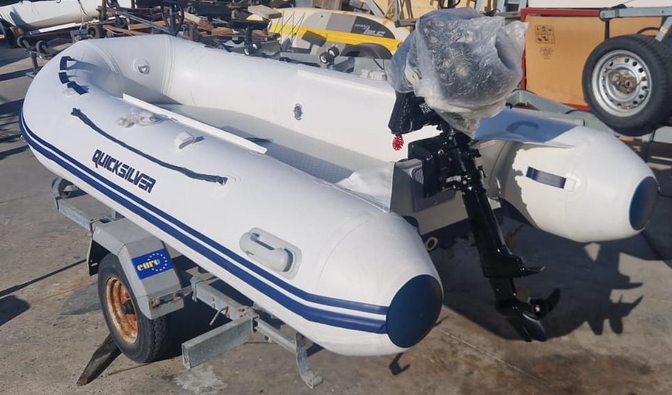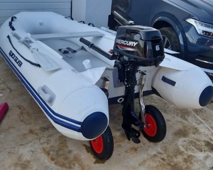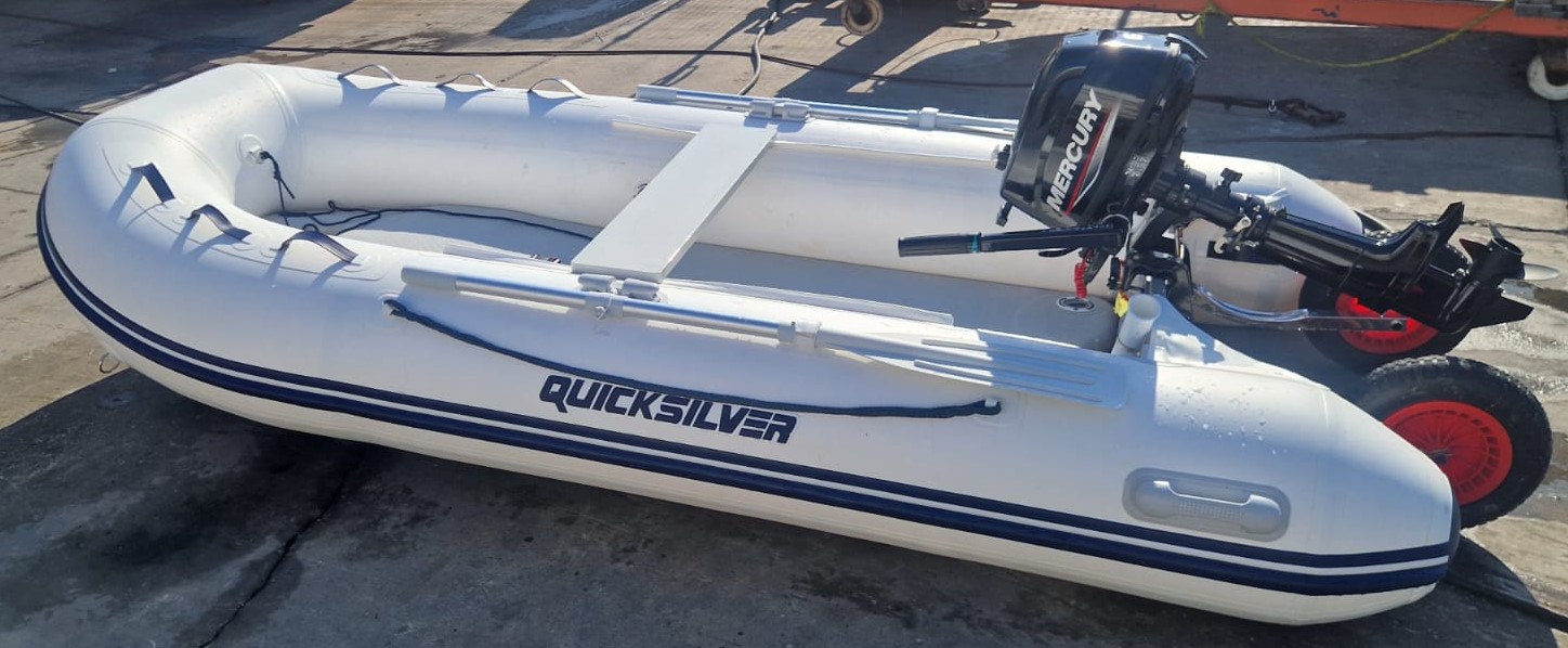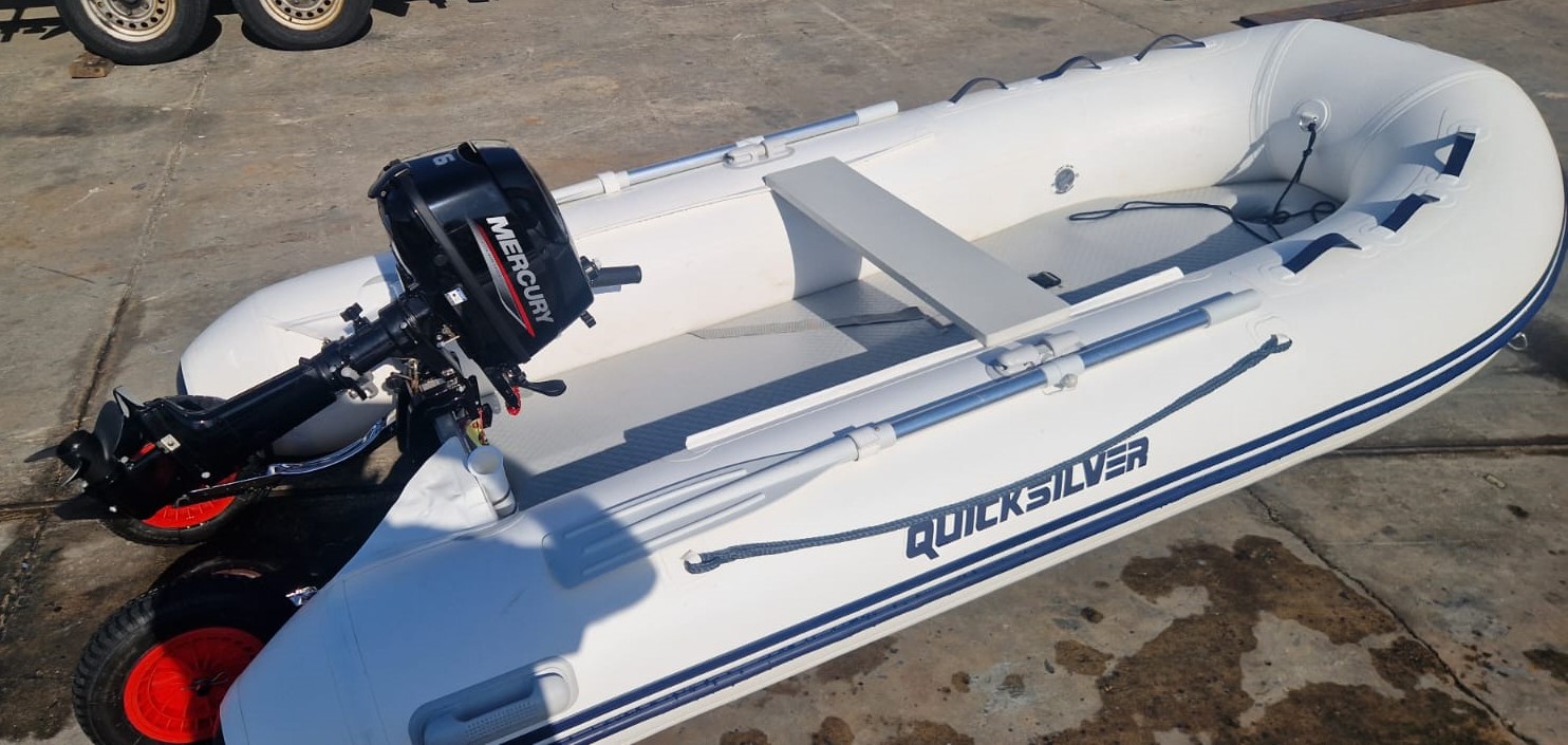 EMBARCACION SEMINUEVA NEUMATICA QUICKSILVER 320 AIR DECK CON MOTOR MERCURY F 6 M , TIENE 15 HORAS DE FUNCIONAMIENTO, INSTALADAS LAS RUEDAS DE POPA PARA FACILITAR LA VARARADA Y BOTADURA CON UNA SOLA PERSONA , DOS CAÑEROS EN POPA, Y ANCLA.